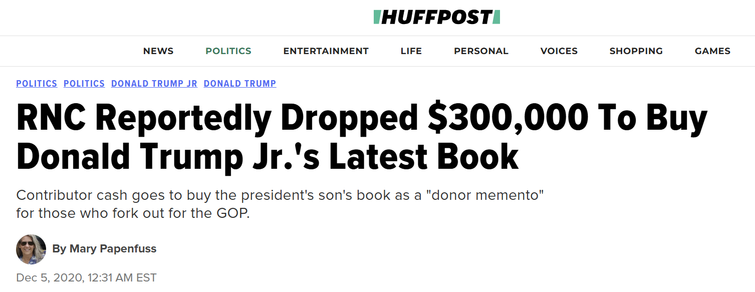 We see a similar action to bolster the apparent public interest of MAGA supporter Donald Turmp Jr.’s ideas through bulk purchases of Jr.’s book by the RNC.